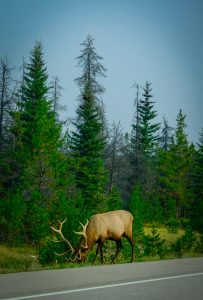 Once we got to the other side of the intersection, he walked off into the trees right off the road. After he left the road, I stopped the truck again and shared some more laughs with K. Just as we started rolling down the hill, I looked in my rearview mirror and wouldn’t you know it, there were now two moose standing in the middle of that intersection behind us. I stopped and told K to turn around and look. It was such a great moment just sitting there watching them stare at us.